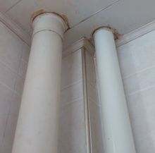 (7)在埋地的排出管施工中常出現(xiàn)的兩個問題:一個是室內地坪以下管道鋪設未在回填土夯實以后進行。造成回填土夯實以后雖在夯實前灌水實驗合格,但使用后管道接口開裂變形滲漏:另一個是隱蔽管道時左右側及上部未用砂子覆蓋,造成尖硬物體或石塊等直接碰觸管外壁,導致管壁損傷變形或滲漏。